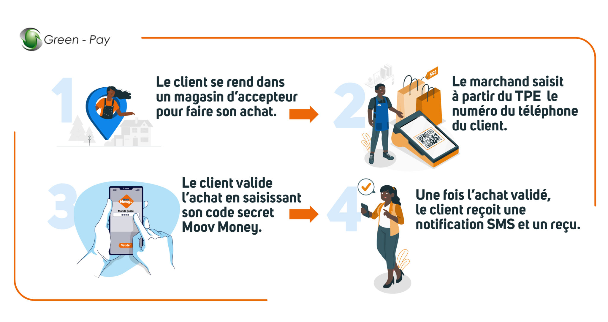 Le Paiement Marchand Green Pay, permet aux abonnés Moov Money de régler leurs achats via leurs comptes dans le réseau d’accepteurs et ce grâce au partenariat avec Green Pay.